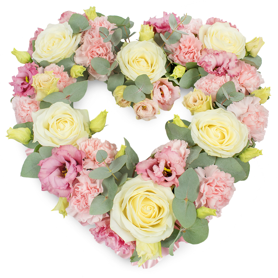 Express your heartfelt condolences with our graceful open heart tribute bouquet. This enchanting arrangement features a delightful combination of white roses, elegant pink carnations, charming pink lisianthus, and aromatic eucalyptus leaves, all meticulously hand-selected to guarantee freshness and beauty.