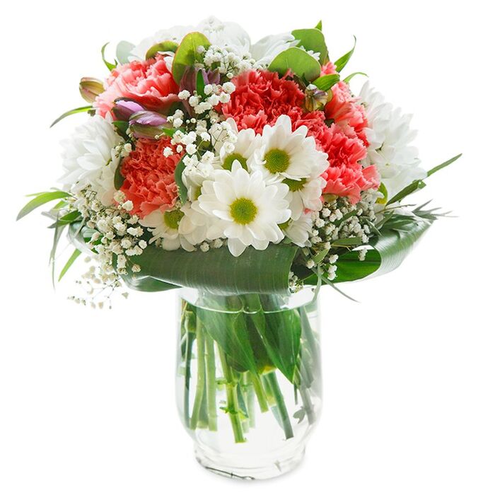 This radiant bouquet is pure delight, styled by skilled hands from St James's and nestled neatly in a classic white gift bag. A joyful assembly of coral and red carnations, their petals plush and ruffled, bursts with warmth like a cheerful market stall on a spring morning near St James's Square. White daisies glow with friendly yellow-green centers, harmonizing gently with gossamer clouds of baby's breath that flutter between the more dramatic blooms. Small purple buds add a secretive spark, inviting the eye to linger, much as one would at a favourite café tucked along King Street. Wrapped in fresh, deep green leaves, the arrangement feels full and carefully tended. Presented in a crisp white gift bag, it's perfect for delivery throughout SW1, ready to impart a sense of happiness and care-whether celebrating a birthday, sharing a congratulatory note, or simply bringing a touch of local beauty to someone's day in the heart of St James's. This radiant bouquet is a tribute to life's happiest occasions, thoughtfully curated to capture the spirit of St James's. Lively white daisies, with golden-green centers bright as morning sunlight, are wrapped in layers of coral-pink carnations with rich, ruffled petals, adding playful depth and softness. Misty clusters of baby's breath float throughout the composition, their delicate bloom reminiscent of dewdrops on a spring lawn in St James's Park. Quietly nestled amidst lush greenery are slender buds, possibly alstroemeria, brushed with hints of purple and blush, promising the ongoing beauty of fresh blooms. Eucalyptus leaves and deep emerald foliage provide a sophisticated finish, framing the bouquet with both structure and subtle fragrance. The palette is fresh and uplifting, a harmonious union of hues that would brighten a windowsill along Pall Mall or serve as a thoughtful gift for a birthday, anniversary, or spontaneous gesture. The arrangement's joyful harmony is a testament to the artistry and love of flowers that defines the local community, ready to bring a touch of St James's elegance to homes and occasions across central London. Infused with the light and sophistication of St James's, this bouquet exudes cheerful sophistication, as though plucked fresh from the hidden gardens behind Pall Mall. Swirling coral carnations blossom at its centre, their ruffled petals lively and full of personality, echoing the energy of the city's vibrant daybreak. Radiant white daisies and bright chrysanthemums, each with a central green eye, radiate purity and charm-like sunlight filtering through lime trees along Jermyn Street. Interlaced with the main blooms, sprays of delicate baby's breath add an ethereal, airy softness, quietly elevating the design. Closed alstroemeria buds in magenta hues glance out from the left, hinting at unfolding beauty still to come. Surrounding everything, broad emerald leaves cradle the bouquet, their sheen reminiscent of St James's Park after gentle rain. Fine, linear greenery threads through the arrangement, giving a sense of movement and natural balance. Crystal-clear water in the transparent vase amplifies the vitality of the bouquet, showcasing robust stems and demonstrating the florists' skilled touch. Against a white background, bright lighting ensures that each colour, texture, and detail can be enjoyed fully-making this piece ideal for occasions of joy, appreciation, or new beginnings in the very heart of St James's.